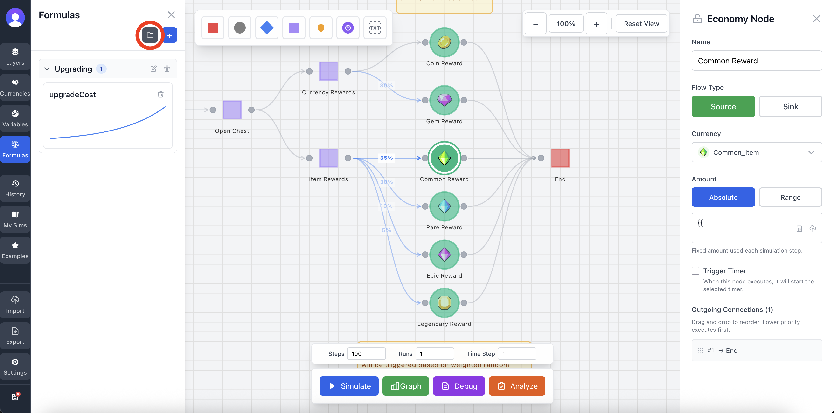One of the more powerful features of formulas is the ability to use them in input fields in other Nodes and Connections. This can be done by writing [[formulaName]]. As you start writing, a dropdown will appear for easy selection. Alternatively, you can press the icon in the far right of an input field to add a formula.